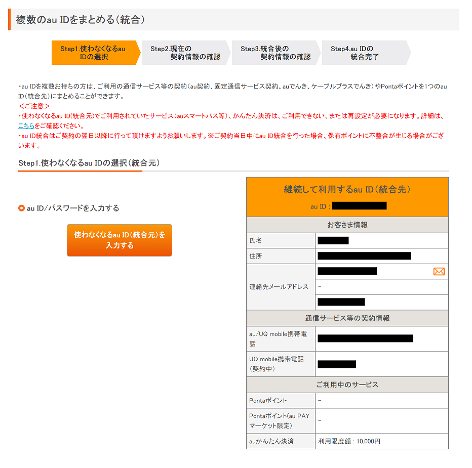 内容をご確認の上、「使わなくなるau ID(統合元)を入力する」ボタンをクリックします。