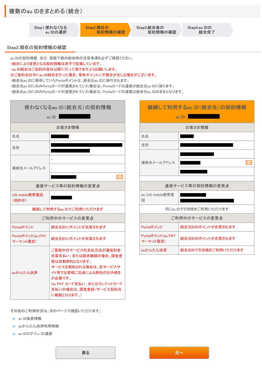 画面左側には使わなくなるau IDの契約情報が、画面右側には継続してご利用いただくau IDの契約情報が表示されます。統合により変更が生じる契約情報は赤字で表示されます。