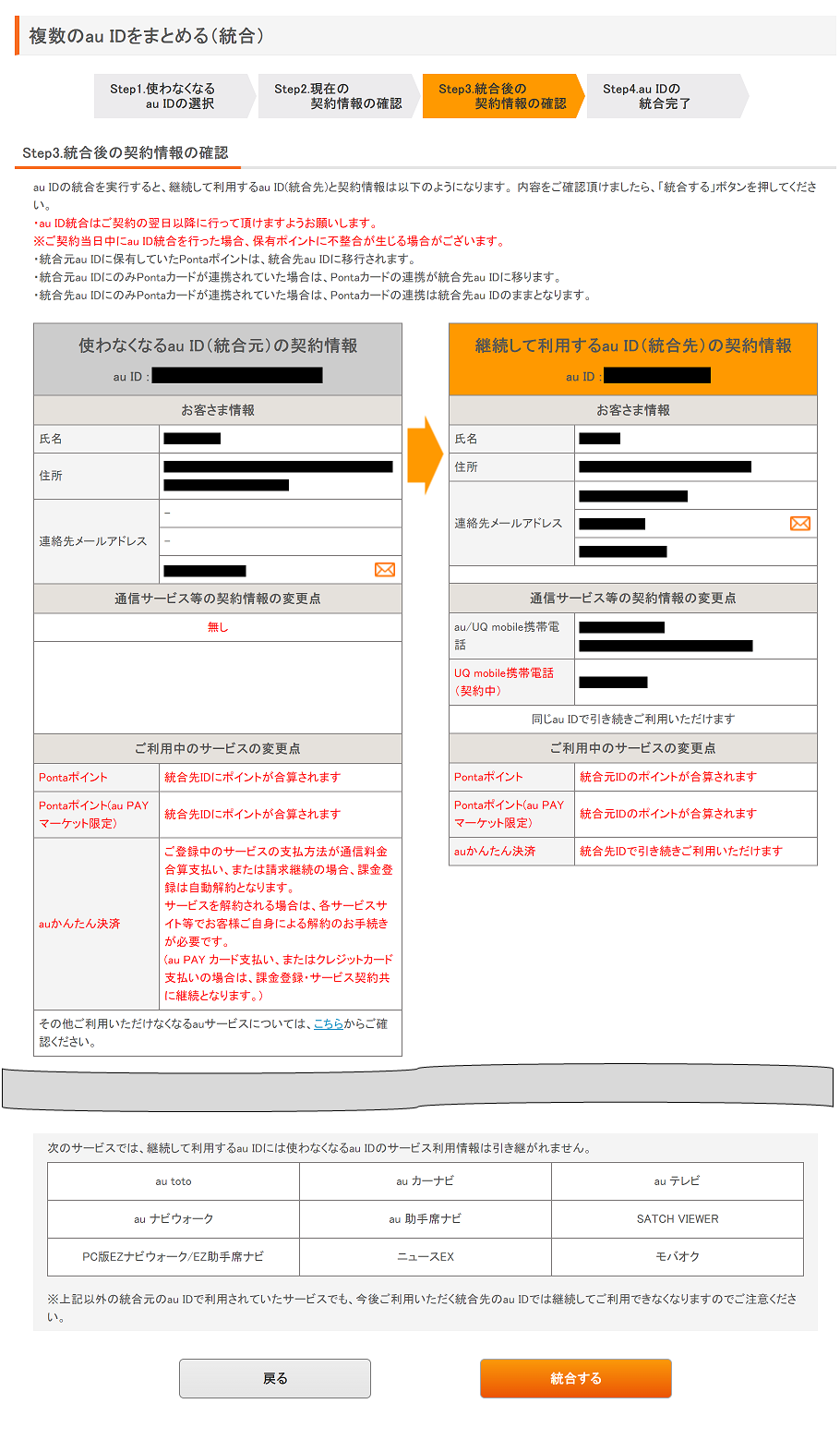 統合時の注意案内および継続して利用するau IDの情報(統合元の情報)が表示されます。